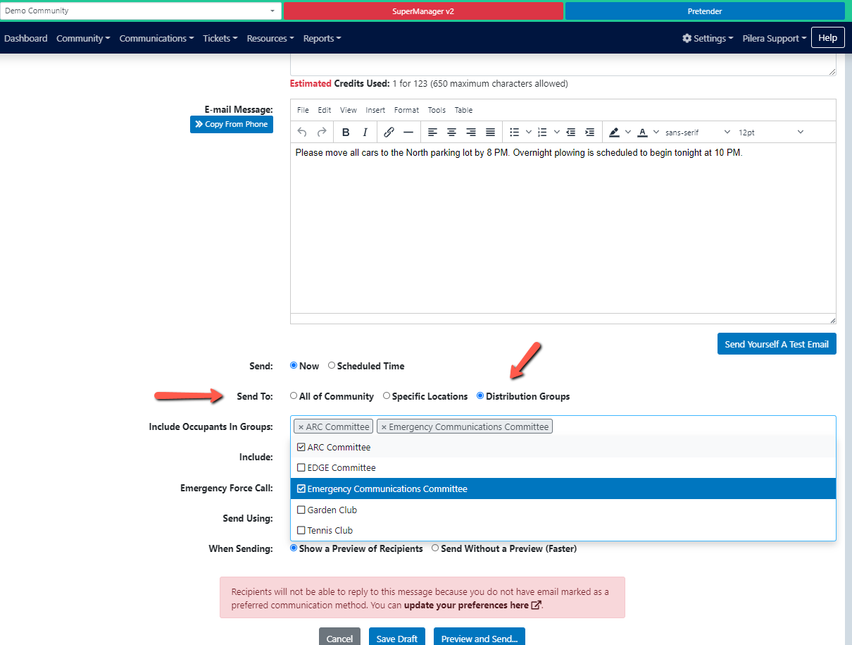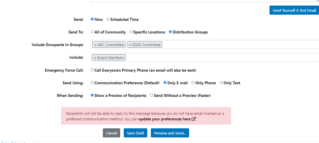 Once you have created your distribution group, it will be available in a drop down in the "Send Announcement" and "Send Document" features. You can still select the types of people you want to message within that distribution group at the time you send the message (Boards, Managers, Owners, etc). You can also send a message to multiple distribution groups at one time, and send out email, phone or text messages to your distribution groups.