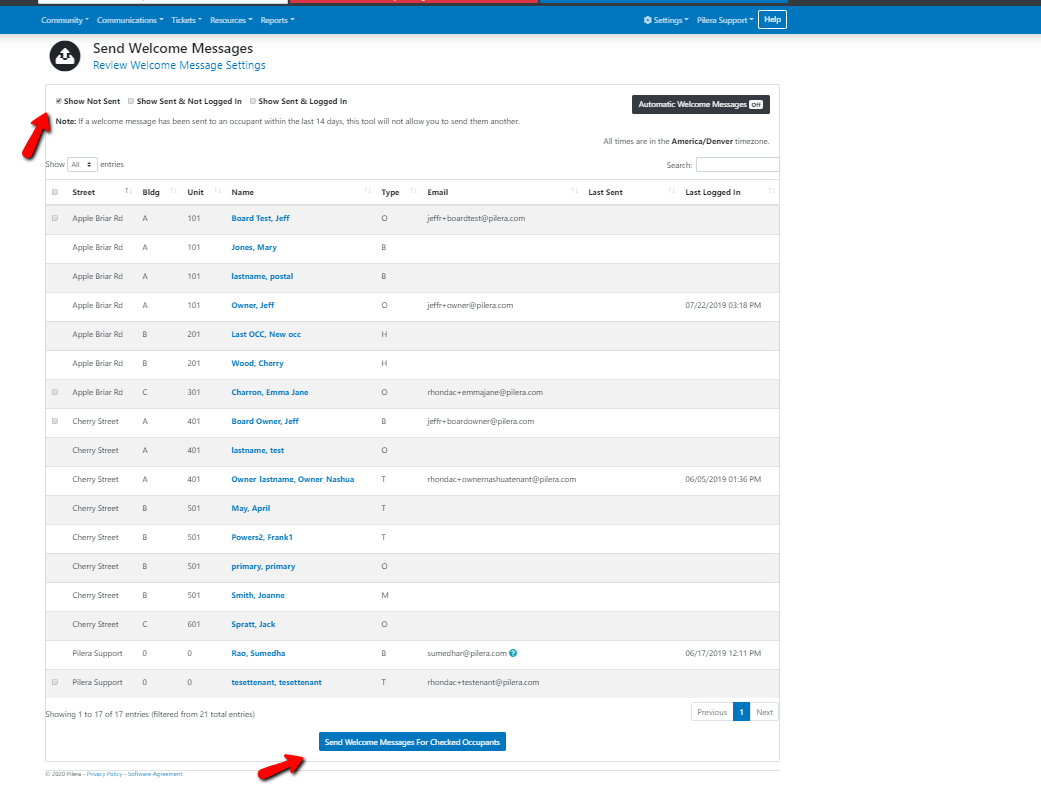 2. IN THE NEW WINDOW make sure to select the ‘show not sent’ checkbox at the top of the page. A list of new occupants who have not received a welcome message yet will be listed. Select the following occupants you wish to send a welcome message to. Once the new occupants have been selected mouse over the blue button ‘Send welcome messages for checked occupants’ to send a welcome message. If there is no check box next to the name, that is because there is no email address on file, or that person has already logged in.